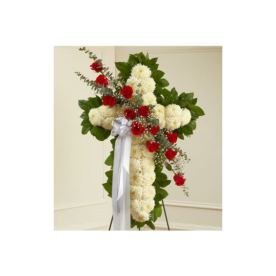 If faith was an important part of their life, our standing cross arrangement is a special way to honor a loved one’s memory. Our expert florists handcraft each of these impressive displays with a bed of white mums in the shape of a cross, and accent with a cascade of red roses and spiral eucalyptus. This floral tribute is a beautiful way for family to offer peace and comfort during a difficult time. •Standing cross arrangement of white football mums and red roses; accented with soft, lush greenery •Our florists use only the freshest flowers available, so colors and varieties may vary